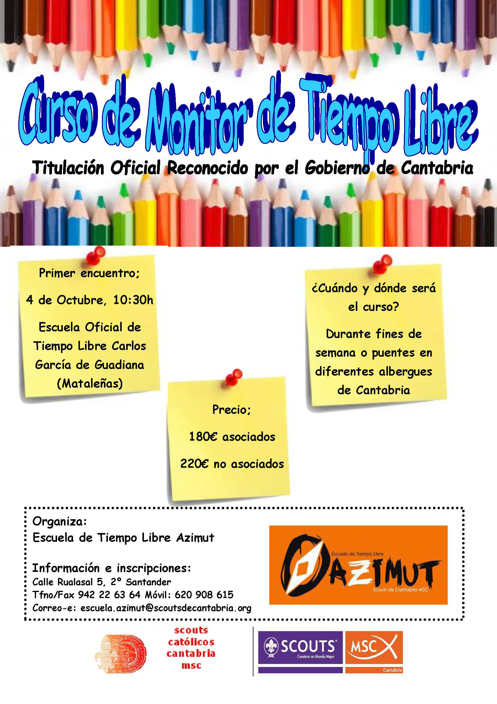 La Escuela de tiempo libre Azimut convoca un nuevo curso de monitor de tiempo libre que se desarrollará durante los fines de semana o puentes en albergues de Cantabria. El primer encuentro tendrá lugar el sábado 4 de octubre a las 10.30 h en la Escuela Oficial de Tiempo Libre Carlos García de Guadiana, situada en Mataleñas, Santander.